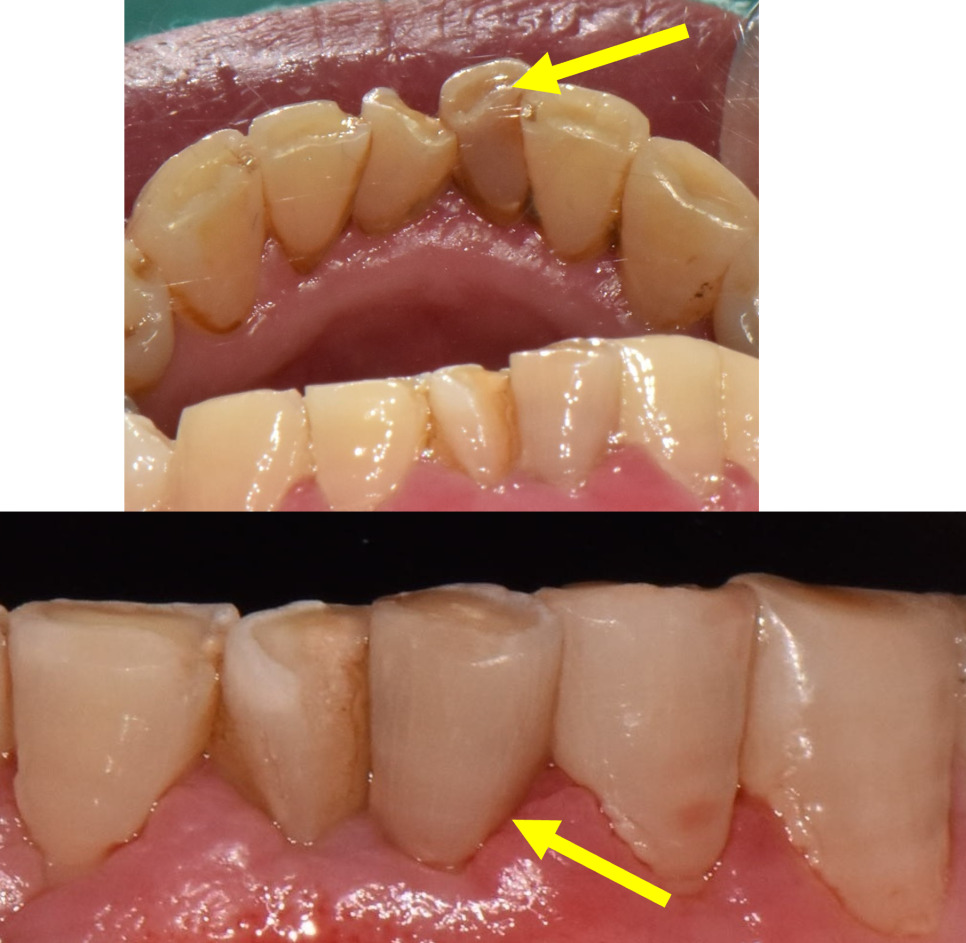 아래쪽 앞니변색이 심하게 관찰됩니다.